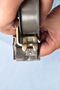 4. Atornillar el tornillo tensor OE (T10092) en el amortiguador hidráulico y girarlo para aflojar lentamente la correa de distribución o el rodillo tensor (figs. 6, 7, 8a y 9) hasta que la herramienta de bloqueo OE (T40011) pueda insertarse en el pequeño orificio del amortiguador hidráulico (figs. 8b y 9).