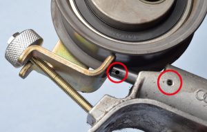 4. Tensar la correa de distribución extrayendo el pasador de bloqueo del amortiguador hidráulico y retirando el tornillo tensor OE (T10092). El amortiguador hidráulico ajustará la tensión. No existen otras marcas en el rodillo tensor.