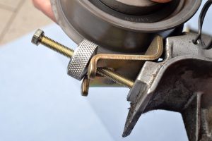 2. Montar el nuevo rodillo tensor (27 Nm) y el nuevo amortiguador hidráulico (15 Nm), y apretar el tornillo tensor OE (T10092) para que, posteriormente, la herramienta de bloqueo pueda retirarse fácilmente del nuevo amortiguador hidráulico (fig. 12). No extraer el pasador de bloqueo antes de que la correa de distribución y el rodillo tensor se encuentren montados correctamente! El amortiguador hidráulico solo debe accionarse mediante el tornillo tensor. Si se ejerce presión con un tornillo de banco o unas pinzas, el amortiguador hidráulico podría resultar dañado.